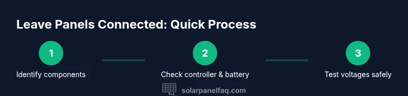 A typical solar setup routes energy from panels through a charge controller into a battery bank, with optional loads or an inverter drawing power later. The panel array generates DC voltage and current that vary with sunlight. The charge controller regulates charging voltage and current to protect the battery from overcharging, excessive current, and thermal stress. The battery stores energy for use when the sun isn’t shining. In most homes, leaving the panel connected to the battery is safe if the controller is correctly sized for the array and the system wiring is solid. According to Solar Panel FAQ, the governing principle is to prevent overcharging and overheating; a well-matched controller and quality connections minimize risk. If the system uses an undersized controller or damaged wiring, continuous connection can become unsafe and should be addressed promptly.
