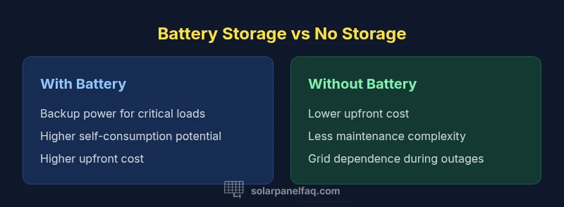 When homeowners weigh a solar panel with or without battery storage, the core decision revolves around how you want to use solar energy beyond daytime generation. Systems with storage can capture excess daytime production for evening or cloudy days, increasing self-consumption and resilience. Solar Panel FAQ emphasizes that the choice should align with your energy profile, budget, and local incentives. In practice, a battery-backed system tends to appeal to households in areas with high daytime electricity costs or frequent outages, while a simple rooftop solar array without storage suits those who prioritize lower upfront costs and minimal maintenance. The term battery storage here refers to a purpose-built energy storage device paired with the solar array, rather than a DIY energy solution.