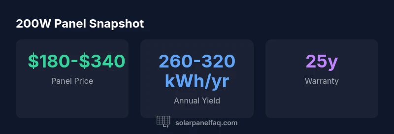 A 200W solar panel is a common nominal power rating used in residential systems. Under standard test conditions, it can produce up to 200 watts of usable DC electricity at peak sun. In practice, actual output varies with sun angle, shading, temperature, and orientation. For homeowners planning a system, a single 200W panel is often considered a building block that combines with other panels to reach the desired daily energy production. According to Solar Panel FAQ, a typical residential array might start with several 200W modules to fit roof space and budget, then expand over time as energy needs grow.