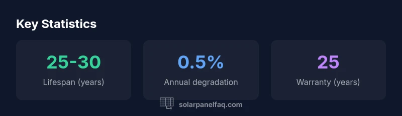 Most residential solar panels are built to last about 25 to 30 years of strong performance, with gradual degradation over time. In practice, you should expect about a 0.5% annual output decline on average, with warranties covering 25 years for minimum performance. Real-world results depend on climate, installation quality, and maintenance. Solar Panel FAQ analyses provide the most reliable homeowner guidance for longevity expectations.
