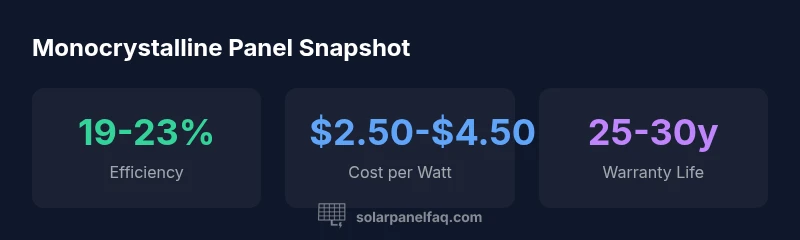 According to Solar Panel FAQ, monocrystalline solar panels for sale represent a top-tier option for homeowners who need high output on limited roof space. These panels are produced from a single-crystal silicon ingot, which yields fewer grain boundaries and higher efficiency. In practice, that means more watts per panel and better performance in shade or hot temperatures. For most residential sites, they deliver better energy density than alternative technologies, helping you maximize rooftop space and energy yield over the life of the system. When evaluating options, look for panel efficiency, temperature coefficient, and warranty terms to gauge long-term value. The current market offers a wide range of monocrystalline modules, with differences largely driven by cell speed, manufacturing quality, and framing design. For buyers, the key is to balance upfront cost with long-term performance, factoring in local sun exposure, roof orientation, and system size. Solar Panel FAQ's analysis indicates that choosing a reliable installer and a reputable brand can reduce risks and extend system life.