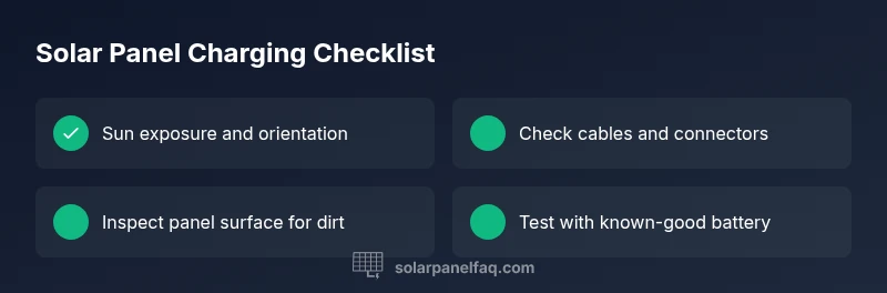 The most likely causes are insufficient sun, a damaged cable, or a mismatched charger. Start by ensuring the panel gets direct sun, inspect cables for wear, and verify the charger is compatible with your camera battery. If the issue persists, test the panel's output under sun and try a known-good battery to isolate the fault. Safety first: unplug devices before testing.