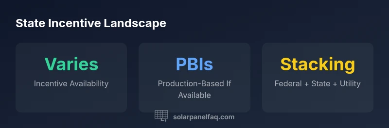 Incentives generally fall into three major categories: tax credits, rebates, and performance-based incentives (PBIs). Tax credits reduce your tax liability and often apply to the total system cost. Rebates provide upfront or post-install cash refunds, while PBIs reward ongoing production, sometimes over several years. The exact availability and stacking rules vary by state. Solar Panel FAQ Analysis (2026) notes that many programs combine multiple incentive types, sometimes with caps or eligibility criteria tied to installation date, equipment efficiency, or local energy goals. It’s common to see a federal incentive mix with state-specific credits or rebates, plus utility-based programs that encourage high-performance systems. When planning, treat PBIs as long-term ROI components rather than one-time savings.