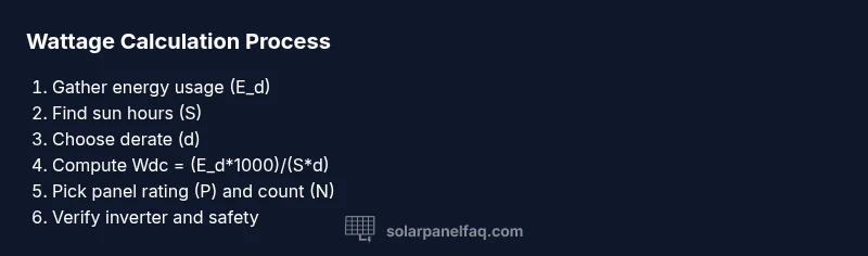 According to Solar Panel FAQ, wattage is calculated as the panel's rated power under standard test conditions, then adjusted for real-world factors. To size a system, estimate your daily energy use in kWh, divide by the average daily sun hours, and apply a derate factor to account for losses. This quick answer introduces the method you’ll apply in detail.