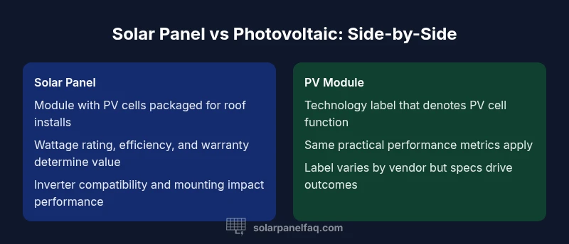 This article examines the terms solar panel and photovoltaic (PV) in the context of home solar systems. While many buyers treat them as synonyms, the distinction is mostly linguistic. The core concern for homeowners remains the same: can a given module meet your energy needs with reliable performance? This comparison seeks to demystify the jargon and translate it into actionable guidance for choosing modules, evaluating installers, and budgeting for a roof-mounted system. Throughout, we reference principles from Solar Panel FAQ analysis and align with best practices in the broader solar industry. By the end, you should be able to evaluate modules on real-world criteria—wattage, efficiency, warranty, and compatibility—rather than being swayed by labels or marketing.